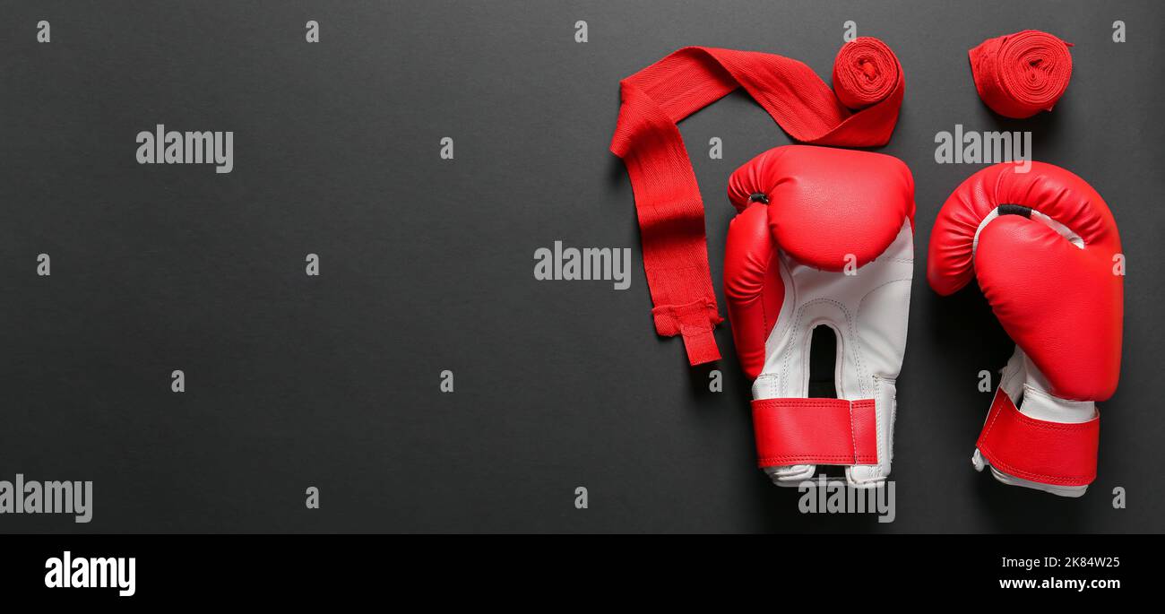 Boxing gloves and wrist bands on dark background with space for text